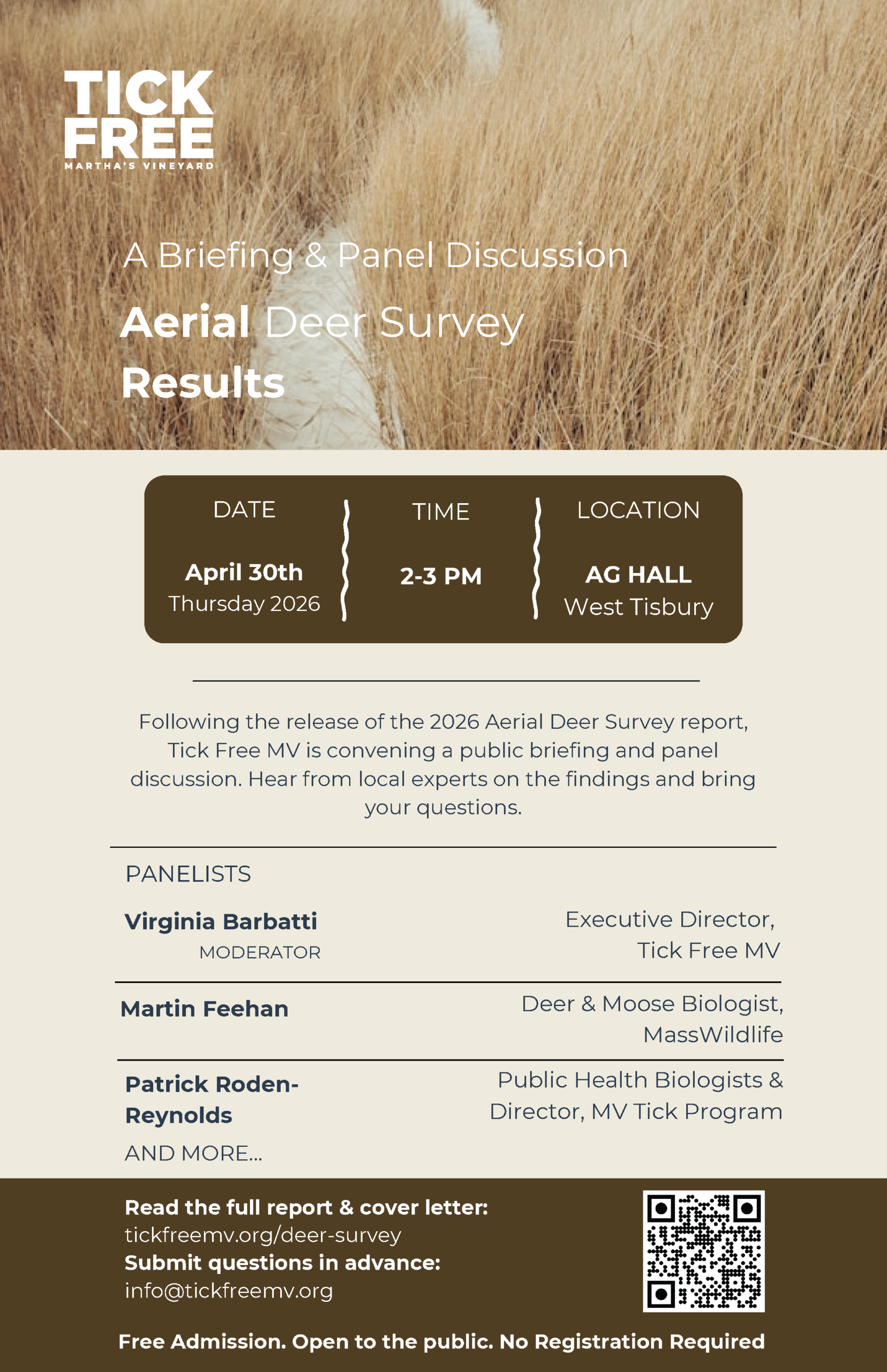 Join the Tick Free Martha’s Vineyard for an upcoming public briefing and panel discussion following the release of the 2026 Aerial Deer Survey report. This event will bring together local and state experts to discuss key findings and take questions from the community.